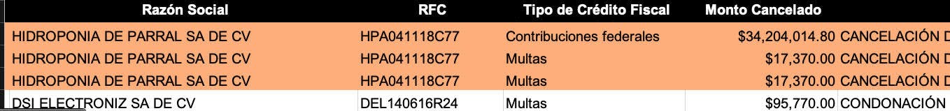 Fue el 15 de febrero de 2022, a cuatro meses de iniciado el actual gobierno, encabezado por Campos, cuando la Secretaría de Hacienda de Chihuahua oficializó la cancelación de tres adeudos fiscales a la empresa Hidroponia de Parral SA de CV por un total de 34 millones 238 mil 754.8 pesos en tres operaciones: una por 34 millones 204 mil 14.8 pesos (por contribuciones federales) y dos más por 17 mil 370 pesos cada una, ambas a razón de multas, como se observa en el registro oficial de contribuyentes.
