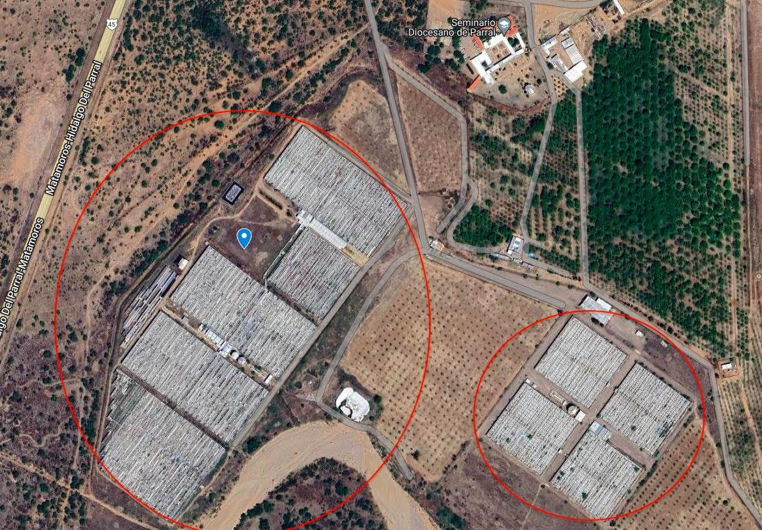 Mapa de ubicación de Hidroponia de Parral, a la salida de la Parral, Chihuahua. Las imágenes encerradas en un círculo en color rojo son las instalaciones de la empresa.